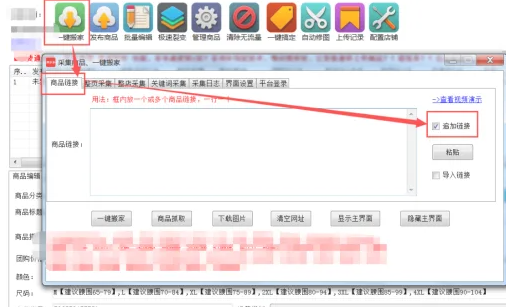 打开登录软件,进入软件主界面,点击一键搬家-商品链接,勾选追加链接。